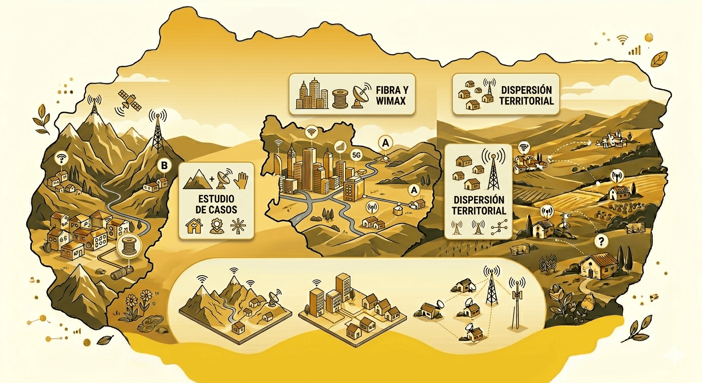 Pueblos muy separados y terreno bastante variado. Los municipios más grandes tienen fibra, pero en zonas rurales y viviendas más aisladas utilizamos tecnologías inalámbricas adaptadas a la dispersión del territorio.